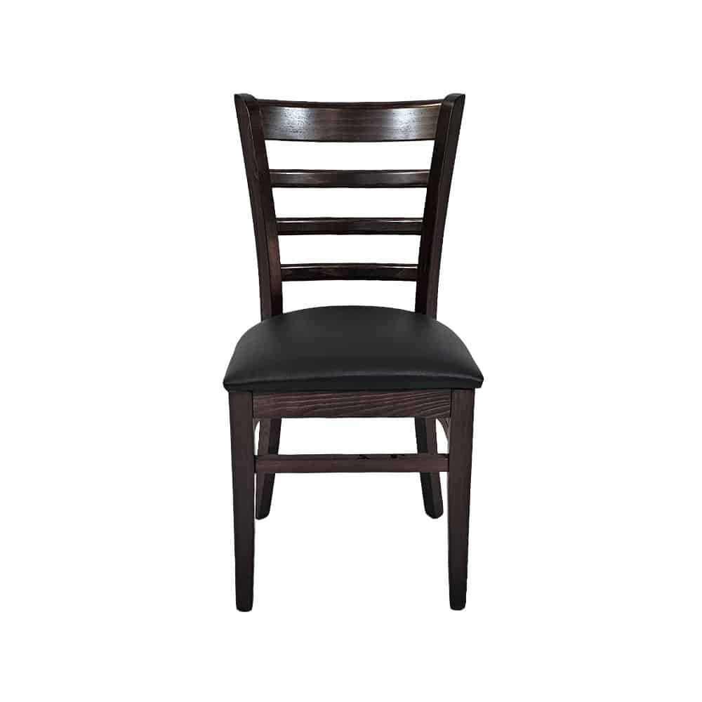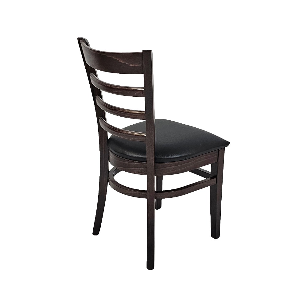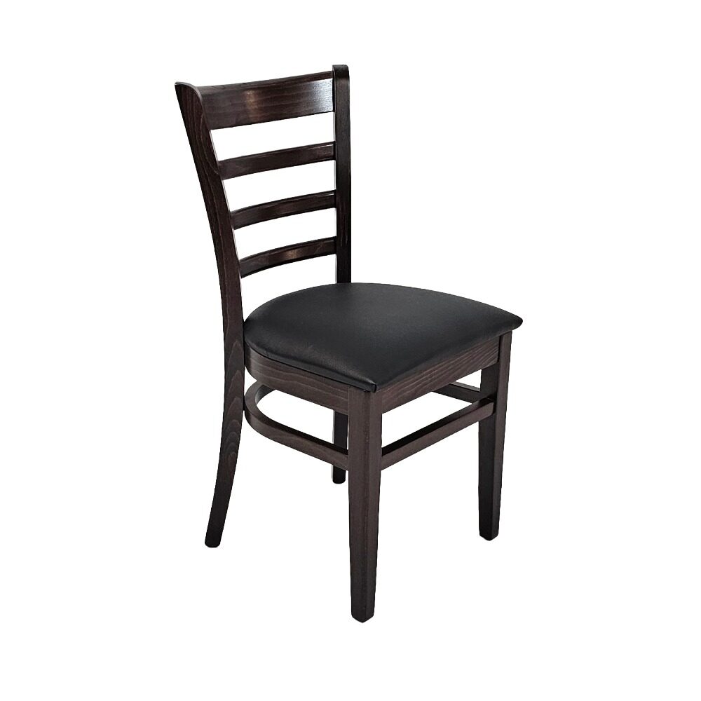 Tyylikäs ravintolatuoli mustalla keinonahkaverhoillulla istuimella ja pähkinänsävyisellä pyökkirungolla.