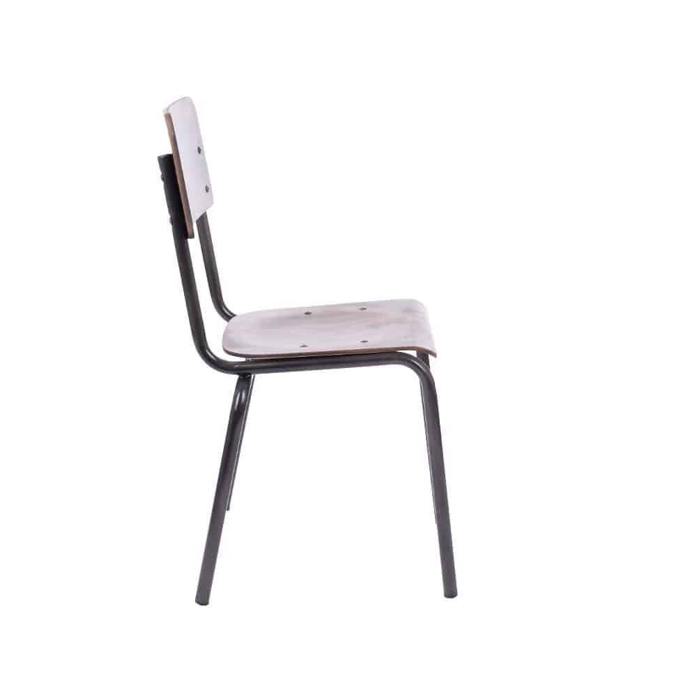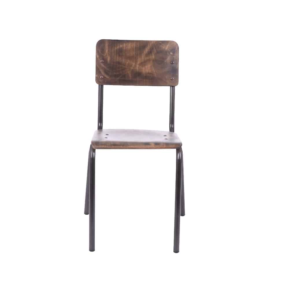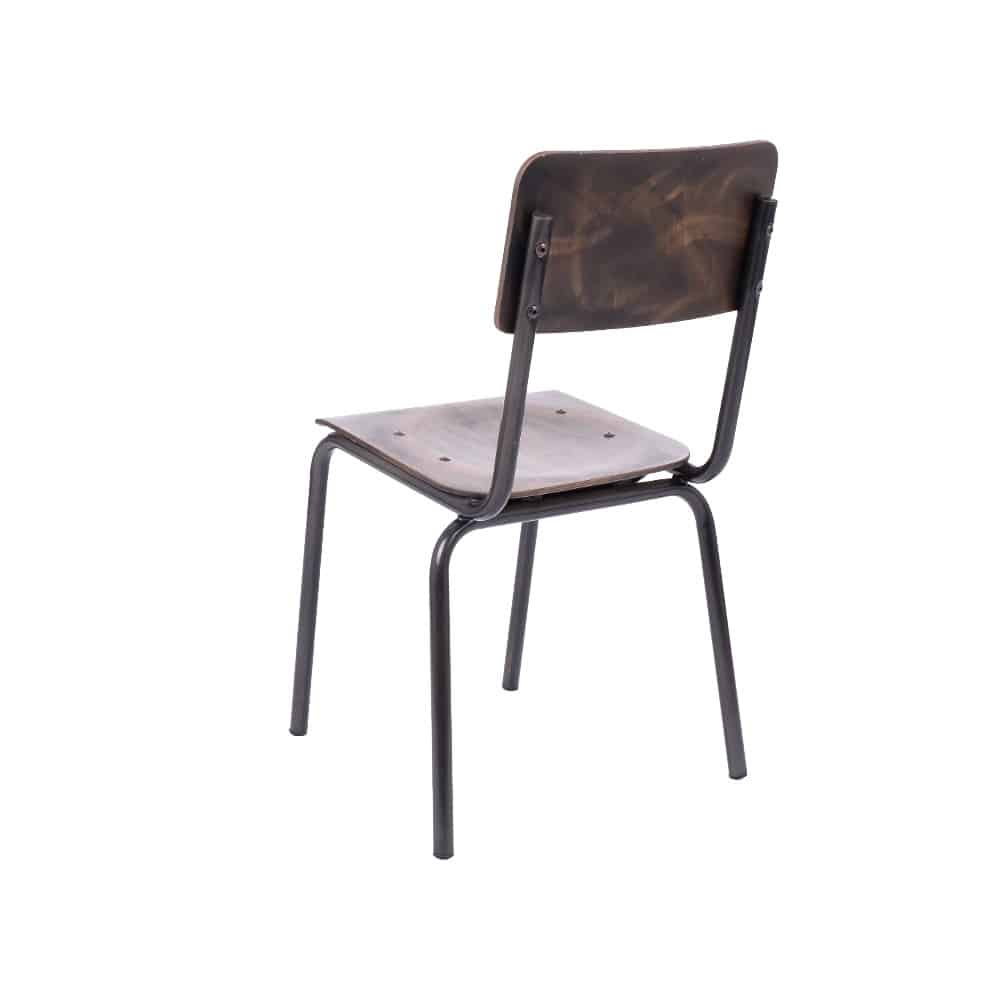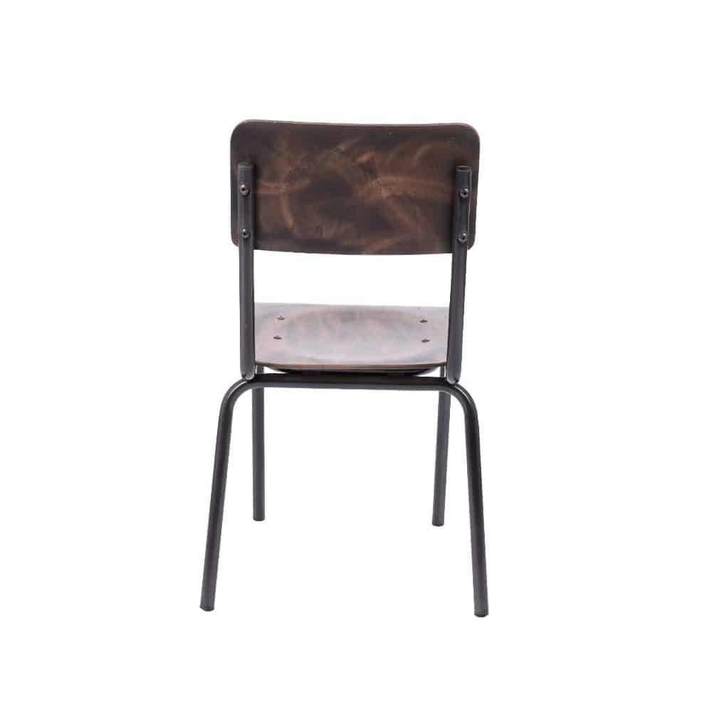 Industrial-henkinen ravintolatuoli pähkinänsävyisellä puuistuimella ja mustalla metallirungolla.
